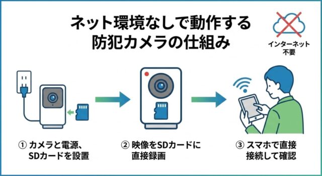 ネット環境なしで使える防犯カメラは、通信を前提とせず「記録を残す」「その場で確認する」機能に特化します。